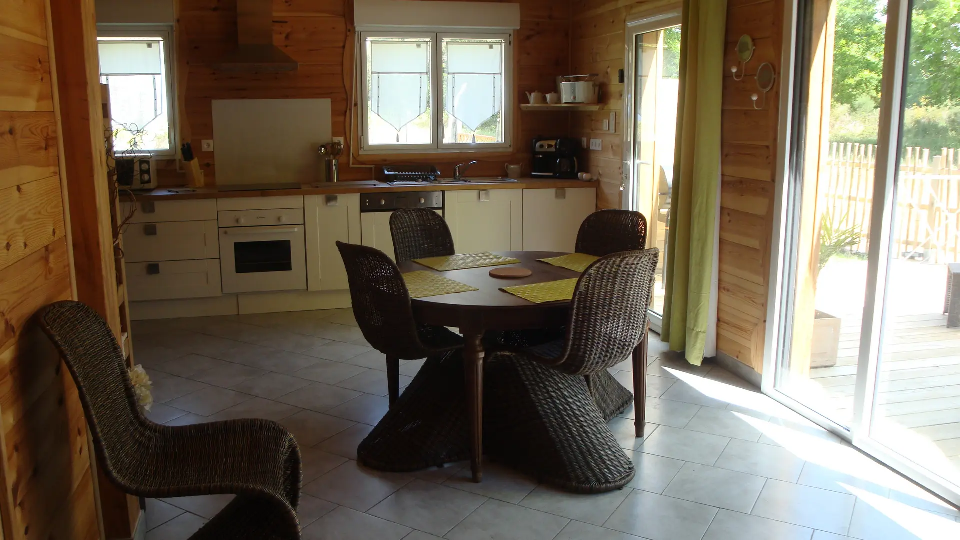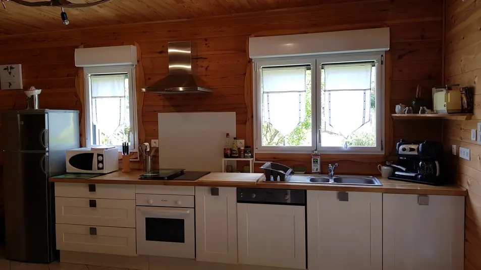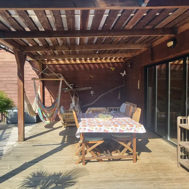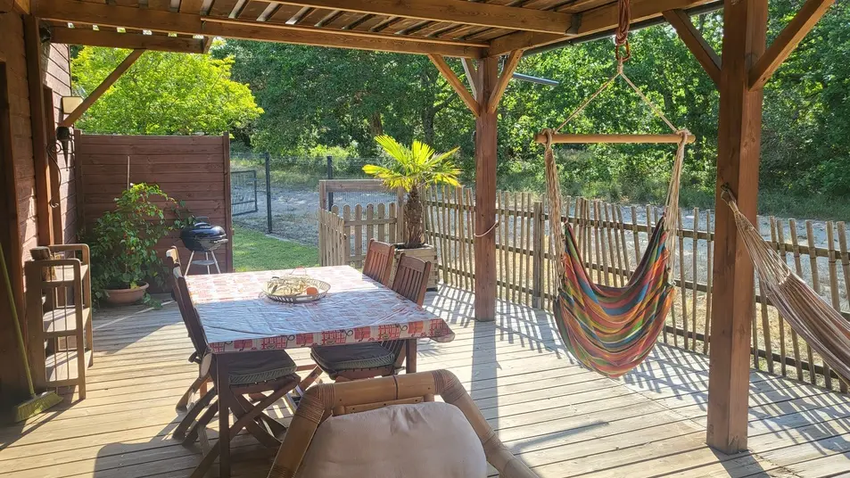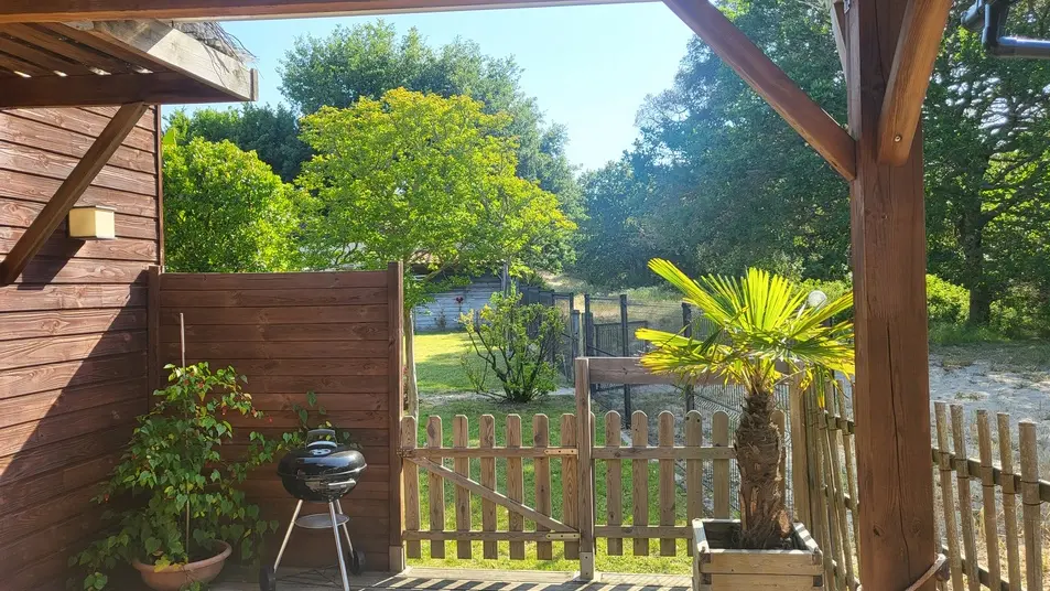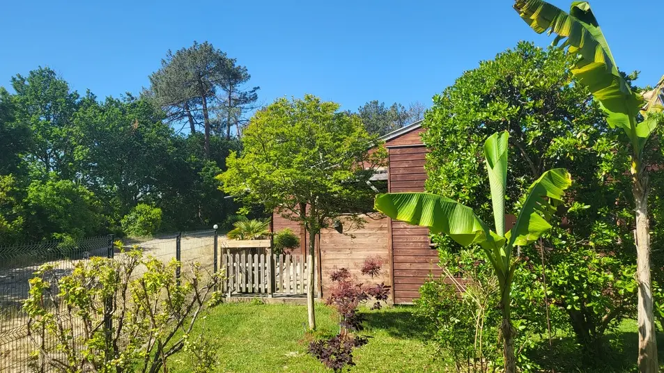 Neues 55 m² großes Holzchalet in einem sehr ruhigen Viertel. Sehr gepflegte Inneneinrichtung. Ausgestattete Küche. Ein Schlafzimmer mit einem 160 cm breitem Bett, ein großer Wohnraum mit zwei 90 cm breiten Betten. Sehr sauber. 40 m² große Terrasse mit Möbeln, nach Süden ausgerichtet und mit Blick auf den Wald. Radwege in der Nähe. Strände und Geschäfte in 2 km.