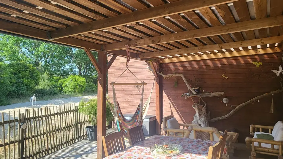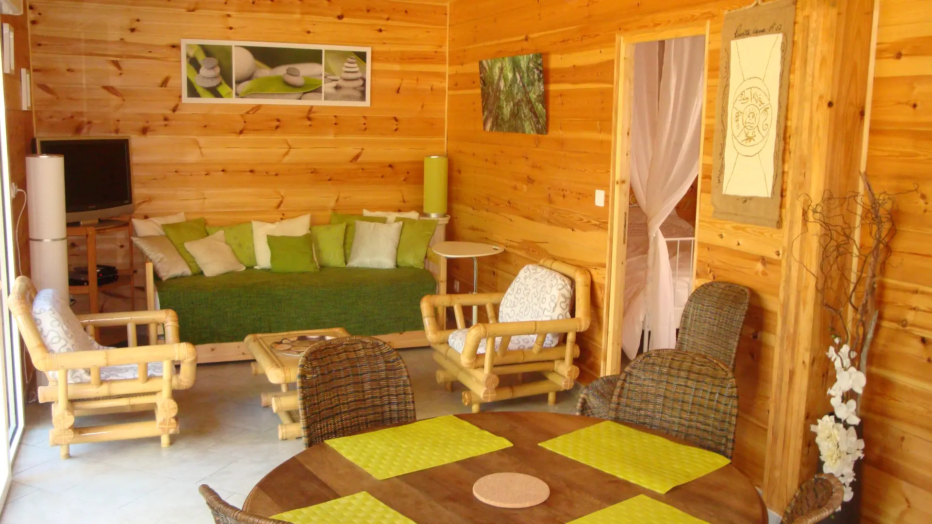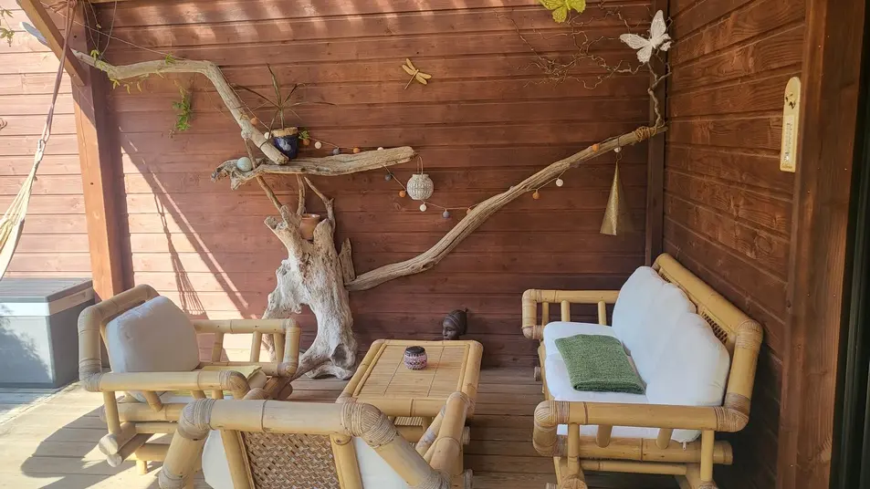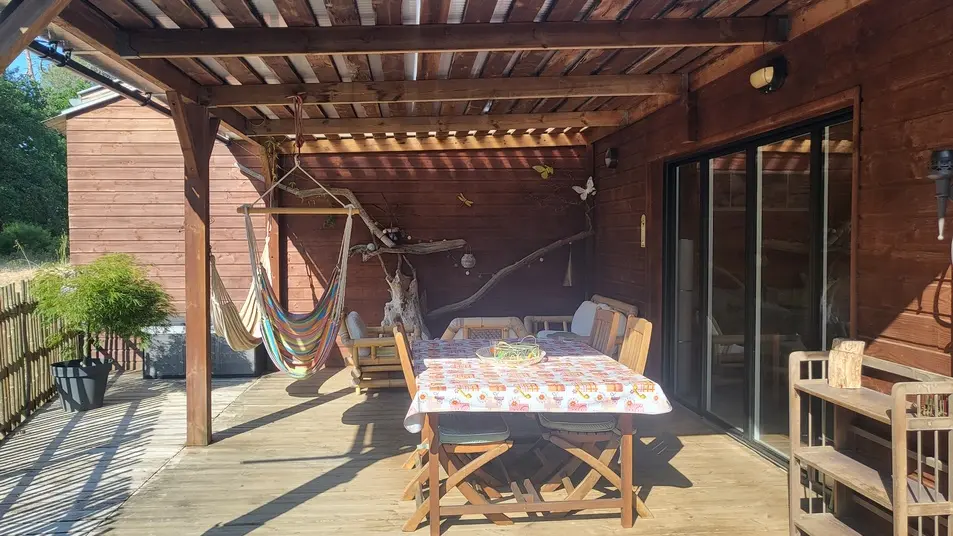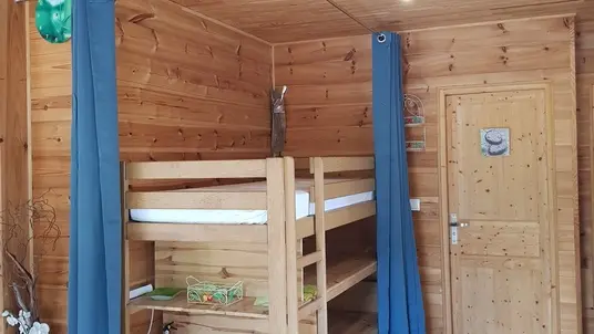 Neues 55 m² großes Holzchalet in einem sehr ruhigen Viertel. Sehr gepflegte Inneneinrichtung. Ausgestattete Küche. Ein Schlafzimmer mit einem 160 cm breitem Bett, ein großer Wohnraum mit zwei 90 cm breiten Betten. Sehr sauber. 40 m² große Terrasse mit Möbeln, nach Süden ausgerichtet und mit Blick auf den Wald. Radwege in der Nähe. Strände und Geschäfte in 2 km.