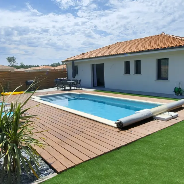 Cette maison est composée de 03 chambres, une salle de bain, une pièce de vie avec sa cuisine ouverte . A l'extérieur profitez de l'espace jardin entièrement équipée avec sa piscine au sel privative et chauffée.