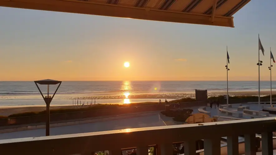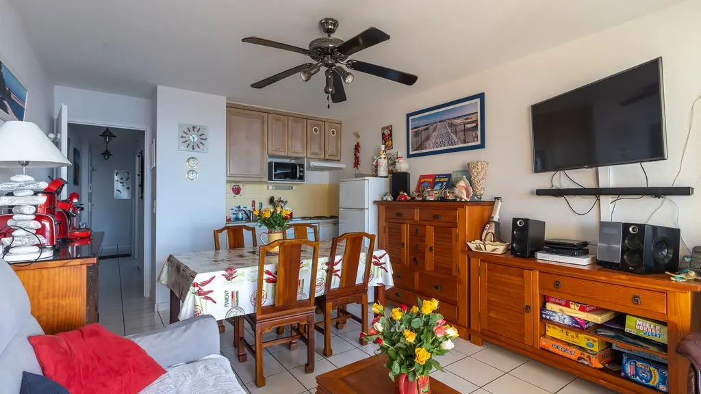 Situé au 2ème étage, l'appartement d'une superficie de 35M2, comprend une salle de séjour avec terrasse en front de mer, kitchenette aménagée (micro ondes, hotte aspirante, plaques de cuisson vitrocéramiques, réfrigérateur, lave vaisselle), salle d'eau avec douche et W.C. lave linge privatif et une chambre à coucher. Orienté plein ouest, vous pourrez ainsi contempler le coucher de soleil depuis le balcon (7 M2 avec auvent à ouverture électrique). Accès immédiat aux immenses plages de sable fin et aux rues piétonnes, centre de vie de la station balnéaire.